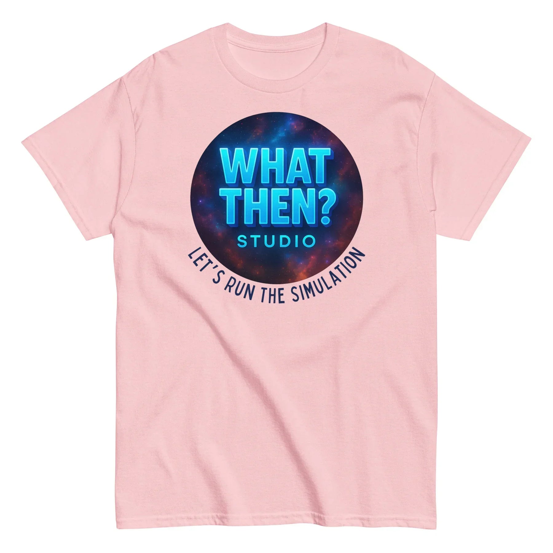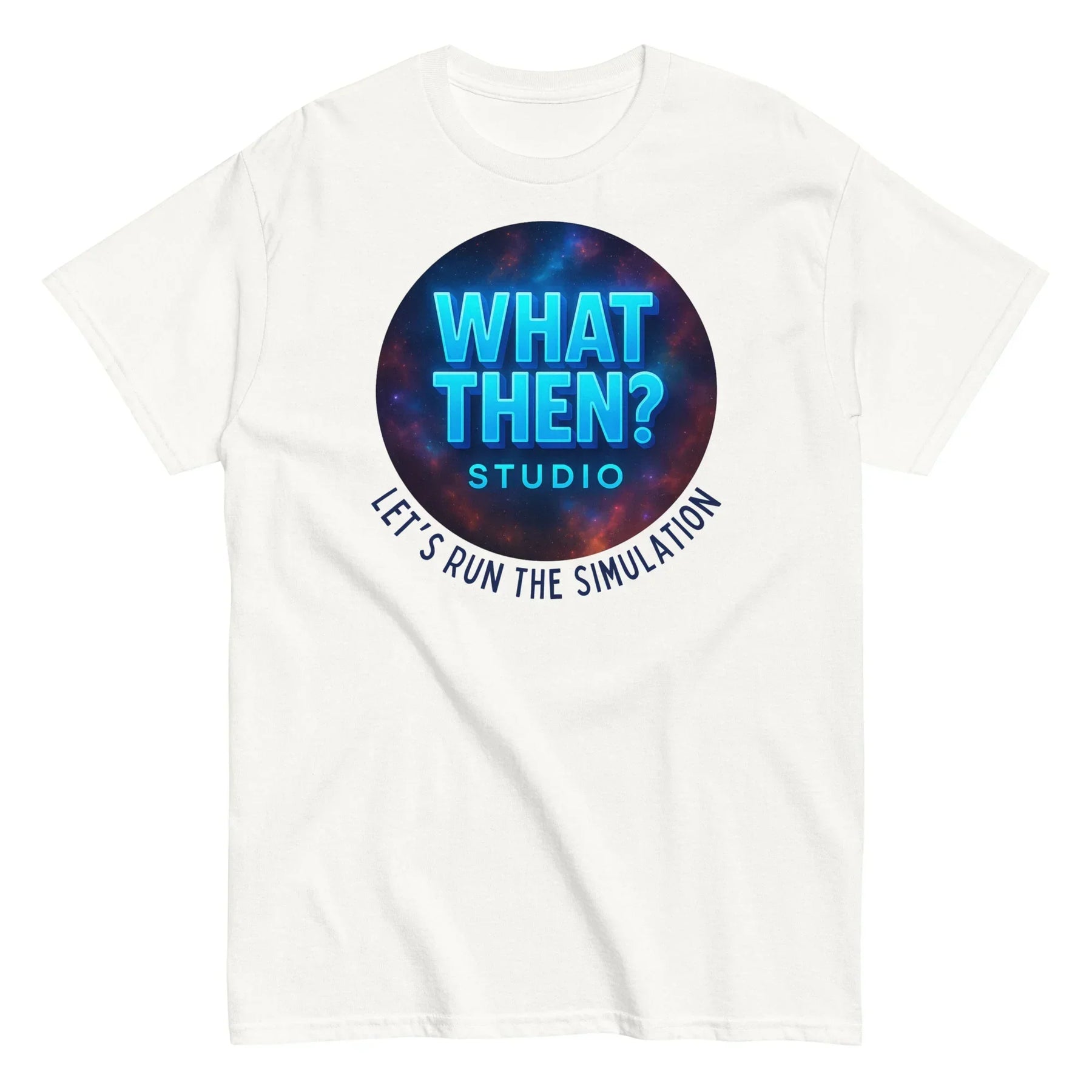 T-shirt classique unisexe What Then? Studio « Let's Run The Simulation » avec logo – Produit officiel What Then? Studio